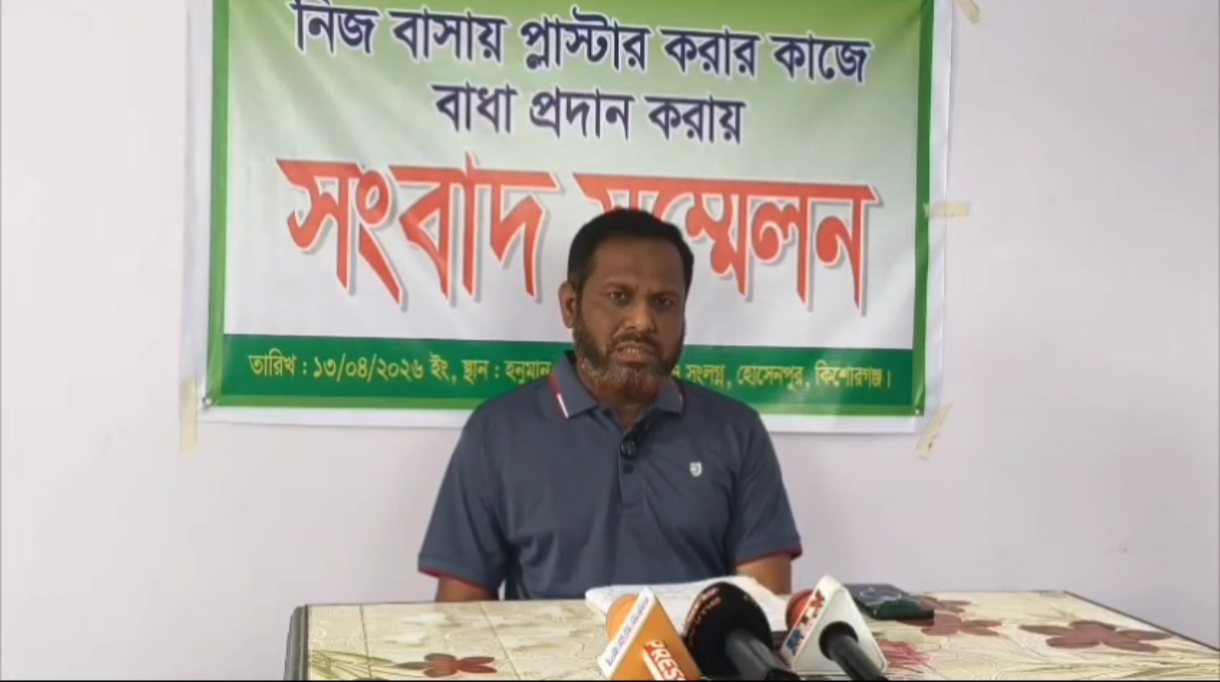 কিশোরগঞ্জের হোসেনপুরে নিজের ভবন নির্মাণ ও প্লাস্টারের কাজে প্রতিবেশীদের বাধা প্রদান, নির্মাণ সামগ্রী নষ্ট এবং প্রাণনাশের হুমকির প্রতিবাদে সংবাদ সম্মেলন করেছেন ভুক্তভোগী মুহাম্মদ রুহুল আমিন।