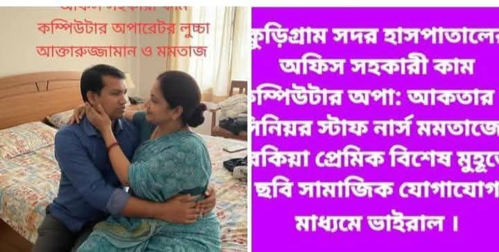 কুড়িগ্রাম সদর হাসপাতালের সিনিয়র স্টাফ নার্স মমতাজ আকতারের বয়সের থেকেও ২০ বছরের বড়। আকতারের মায়ের বয়সী বয়স। এদিকে মমতাজের আগে স্বামীর দুইটি মেয়ে আছে। মমতাজের প্রথম মেয়ে আকতারের বয়সের সমান বয়সী থাকার পরও তারা পরকীয়া করার সময় উলঙ্গ অবস্থায় আকতার ও মমতাজ হাতেনাতে হাসপাতালের অফিস কক্ষে আটক। আকতারের প্রথম বউয়ের দুইটা বাচ্চা আছে, ১ম বউ থাকা সত্ত্বেও কুড়িগ্রাম সদর হাসপাতালের অফিস সহকারী কাম কম্পিউটার অপারেটর আখতারুজ্জামান ও মমতাজ এর বিরুদ্ধে পরকীয়া ও অনৈতিক কর্মকাণ্ডে লিপ্ত হওয়ার গুরুতর অভিযোগ উঠেছে। সম্প্রতি একটি বিশেষ মুহূর্তের ছবি সামাজিক যোগাযোগ মাধ্যমে ছড়িয়ে পড়ার ঘটনা জেলা জুড়ে ব্যাপক চাঞ্চল্যের সৃষ্টি হয়েছে।