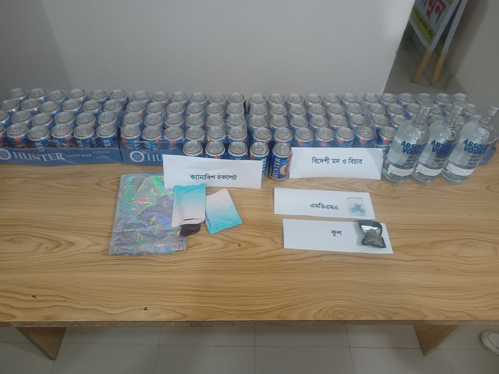 গ্রেফতারকৃতরা হলেন, রাজধানীর অভিজাত এলাকা গুলশান-২ এর বাসিন্দা জাহিদুল আলম জয় (৩৪), বাড্ডা এলাকার রেদোয়ান হাসান চৌধুরী (৩৩), কাফরুল এলাকার ফয়জুল ইসলাম খান লাবিব, বসুন্ধরা আবাসিক এলাকা, মোঃ আবির হোসেন (২৩), ইফতিয়ার কাসেম চালী (৩০) এবং গাজীপুরের বাঘের বাজার এলাকার জিহাদ আহম্মেদ রাফি (১৯)। অভিযান চলাকালীন রিসোর্টের ডিজে পার্টি এবং ২০৯ ও ৪০৬ নম্বর কক্ষ থেকে বিপুল পরিমাণ নিষিদ্ধ মাদকদ্রব্য জব্দ করা হয়। এর মধ্যে রয়েছে, এমডিএমএ (এক্সটাসি): ৯ পিস (৫.৫ গ্রাম), কুশ: ৫ গ্রাম, ক্যানাবিস চকলেট: ১৬৫ গ্রাম (২ প্যাকেট), বিয়ার (হান্টার): ১০১ ক্যান (৩৩.৩৩ লিটার), বিদেশী মদ: ৩ বোতল (অ্যাবসোলিউট ভোদকা)।প্রাথমিক জিজ্ঞাসাবাদে জানা গেছে, ‘আর্ট এক্স’ নামের ব্যানারে জাহিদুল আলম জয়ের নেতৃত্বে এই ডিজে পার্টির আয়োজন করা হয়েছিল। ডিজে পার্টির আড়ালে তরুণ-তরুণীদের মাঝে বিভিন্ন সিনথেটিক মাদক সরবরাহ করা হচ্ছিল।