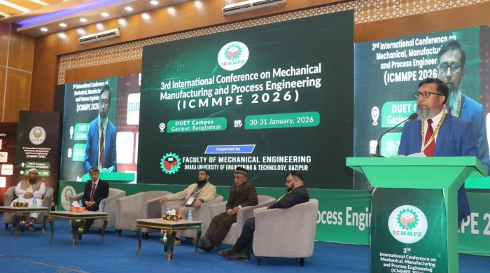 ঢাকা প্রকৌশল ও প্রযুক্তি বিশ্ববিদ্যালয় (ডুয়েট), গাজীপুর-এ শুক্রবার (৩০ জানুয়ারি.) ‘থার্ড ইন্টারন্যাশনাল কনফারেন্স অন মেকানিক্যাল, ম্যানুফ্যাকচারিং অ্যান্ড প্রোসেস ইঞ্জিনিয়ারিং (আইসিএমএমপিই-২০২৬)’ শীর্ষক দুইদিন ব্যাপী আন্তর্জাতিক কনফারেন্সের উদ্বোধন করা হয়।