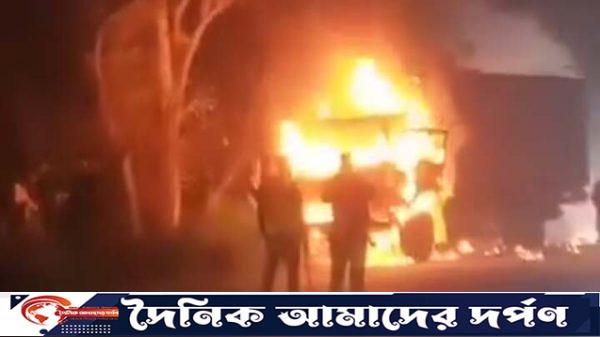 কাভার্ড ভ্যানটি উল্লাপাড়ায় পৌঁছালে কয়েকজন দুর্বৃত্ত আগুন দিয়ে পালিয়ে যায়।