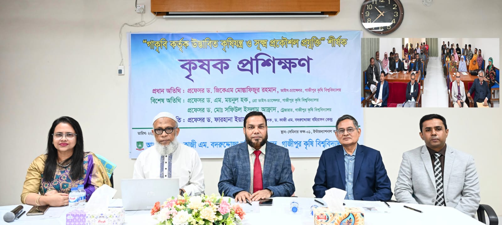বাংলাদেশের কৃষিকে আরও আধুনিক, টেকসই ও উৎপাদনমুখী করার প্রত্যয়ে গাজীপুর কৃষি বিশ্ববিদ্যালয়ে (গাকৃবি) অনুষ্ঠিত হলো কৃষিযন্ত্র ও সূক্ষ্ম প্রকৌশল প্রযুক্তি বিষয়ক এক ব্যতিক্রমধর্মী কৃষক প্রশিক্ষণ। কৃষকের জীবনমান উন্নয়ন, কৃষি প্রযুক্তির সঠিক ব্যবহার এবং স্বল্প সময়ে অধিক উৎপাদনের বাস্তবসম্মত পথ দেখাতেই এই প্রশিক্ষণের আয়োজন করা হয়। ২২ জানুয়ারি (বৃহস্পতিবার) গাজীপুর কৃষি বিশ্ববিদ্যালয়ের বহিরাঙ্গন কেন্দ্রের আয়োজনে বিশ্ববিদ্যালয়ের ইন্টারন্যাশনাল কমপ্লেক্সের সেমিনার কক্ষে দিনব্যাপী এই প্রশিক্ষণ অনুষ্ঠিত হয়। গাজীপুর সদর ও শ্রীপুর উপজেলা থেকে আগত ৪০ জন কৃষক-কৃষাণীর স্বতঃস্ফূর্ত অংশগ্রহণে পুরো আয়োজনটি পরিণত হয় এক জ্ঞান বিনিময়ের মঞ্চে। দুটি পর্বে অনুষ্ঠিত প্রশিক্ষণের প্রথম পর্বে প্রধান অতিথি হিসেবে উপস্থিত ছিলেন গাকৃবির ভাইস-চ্যান্সেলর প্রফেসর ড. জিকেএম মোস্তাফিজুর রহমান। বিশেষ অতিথি হিসেবে উপস্থিত ছিলেন প্রো-ভিসি প্রফেসর ড. এম. ময়নুল হক এবং ট্রেজারার প্রফেসর ড. মোঃ সফিউল ইসলাম আফ্রাদ। অনুষ্ঠানে সভাপতিত্ব করেন গাকৃবির বহিরাঙ্গন কেন্দ্রের পরিচালক প্রফেসর ড. ফারহানা ইয়াসমিন। এছাড়া বিভিন্ন অনুষদের ডিনবৃন্দও অনুষ্ঠানে উপস্থিত ছিলেন। প্রশিক্ষণের শুরুতেই প্রশিক্ষণার্থীদের একটি আন্তরিক ও প্রাণবন্ত পরিচিতি পর্ব অনুষ্ঠিত হয়। এ সময় কৃষকরা তাঁদের চাষাবাদ করা ফসলের ধরন তুলে ধরেন এবং আধুনিক প্রযুক্তির মাধ্যমে কীভাবে স্বল্প সময়ে উৎপাদন বৃদ্ধি করা যায় সে বিষয়ে দিকনির্দেশনা কামনা করেন। এরপর আমন্ত্রিত অতিথিবৃন্দ কৃষির উৎকর্ষ সাধনের উপর বক্তব্য প্রদান করেন। এ সময় প্রধান অতিথির বক্তব্যে ভাইস-চ্যান্সেলর কৃষকদের "সবচেয়ে বড় বিজ্ঞানী" আখ্যা দিয়ে বলেন, "যেকোনো কৃষি প্রযুক্তির উদ্ভাবন তখনই সার্থক হয়, যখন তা গবেষণাগার থেকে বের হয়ে কৃষকের দোরগোড়ায় পৌঁছে মাঠ পর্যায়ে কার্যকরভাবে ব্যবহৃত হয়। দেশের ক্রমবর্ধমান জনগোষ্ঠীর খাদ্য চাহিদা পূরণে গাকৃবি উদ্ভাবিত কৃষি প্রযুক্তিগুলো এক্ষেত্রে গুরুত্বপূর্ণ ভূমিকা রাখতে পারে।" তিনি আরও বলেন, বাংলাদেশের কৃষিকে আরও সমৃদ্ধ ও টেকসই করতে গাজীপুর কৃষি বিশ্ববিদ্যালয়ের বিজ্ঞানীরা নিরলসভাবে কাজ করে যাচ্ছেন।" প্রশিক্ষণের দ্বিতীয় পর্বে গাকৃবির কৃষি যন্ত্র ও সূক্ষ্ম প্রকৌশল বিভাগের প্রফেসর ড. মোঃ অহিদুজ্জামান এবং প্রফেসর ড. মোঃ মোস্তাফিজার রহমান সচিত্র উপস্থাপনার পাশাপাশি হাতে-কলমে প্রশিক্ষণ প্রদান করেন। আধুনিক কৃষিযন্ত্র ও প্রযুক্তির বাস্তব প্রয়োগ সম্পর্কে সরাসরি ধারণা পেয়ে কৃষকরা ব্যাপকভাবে উপকৃত হন। পরে সভাপতির বক্তব্যে প্রফেসর ড. ফারহানা ইয়াসমিন বলেন, প্রশিক্ষ