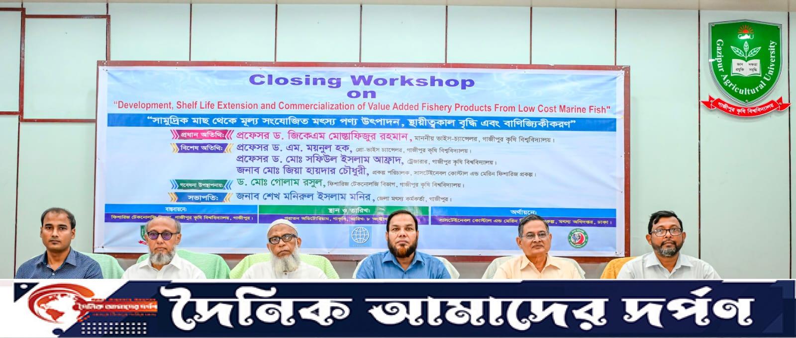 গাজীপুর কৃষি বিশ্ববিদ্যালয়ে (গাকৃবি) অনুষ্ঠিত হলো "সামুদ্রিক মাছ থেকে মূল্য সংযোজিত মৎস্য পণ্য উৎপাদন, স্থায়ীত্বকাল বৃদ্ধি এবং বাণিজ্যিকীকরণ" বিষয়ক এক বিশেষ কর্মশালার সমাপনী অনুষ্ঠান। বিশ্ববিদ্যালয়ের ফিশারিজ টেকনোলজি বিভাগের আয়োজনে এবং মৎস্য অধিদপ্তর, ঢাকা এর অধীন সাসটেইনেবল কোস্টাল অ্যান্ড মেরিন ফিশারিজ প্রকল্পের অর্থায়নে কর্মশালাটি ৮ অক্টোবর (বুধবার) সকাল ১০টায় বিশ্ববিদ্যালয়ের পুরাতন অডিটোরিয়ামে অনুষ্ঠিত হয়। কর্মশালার প্রধান লক্ষ্য ছিল সামুদ্রিক মাছের অপার সম্ভাবনাকে কাজে লাগিয়ে বাংলাদেশে উন্নত প্রযুক্তিনির্ভর, মূল্য সংযোজিত মৎস্য পণ্য তৈরির কৌশল ও উদ্যোগকে ত্বরান্বিত করা। বিশেষ করে সামুদ্রিক ম্যাকারেল মাছ থেকে বার্গার ও টুনা মাছ থেকে আচার তৈরি করে কীভাবে মৎস্য পণ্যের আন্তর্জাতিক বাজারে প্রতিযোগিতার সক্ষমতা অর্জন, দেশিয় উদ্যোক্তা তৈরি এবং উপকূলীয় জনগোষ্ঠীর অর্থনৈতিক উন্নয়ন নিশ্চিত করা সম্ভব হবে তার নিরিখে এ কর্মশালার আয়োজন। অনুষ্ঠানে প্রধান অতিথি হিসেবে উপস্থিত ছিলেন গাকৃবির ভাইস-চ্যান্সেলর প্রফেসর ড. জিকেএম মোস্তাফিজুর রহমান। গাজীপুর জেলা মৎস্য কর্মকর্তা শেখ মনিরুল ইসলাম মনির এর সভাপতিত্বে অনুষ্ঠিত কর্মশালায় বিশেষ অতিথি হিসেবে উপস্থিত ছিলেন গাকৃবির প্রো-ভিসি প্রফেসর ড. এম. ময়নুল হক, ট্রেজারার প্রফেসর ড. মোঃ সফিউল ইসলাম আফ্রাদ এবং মৎস্য অধিদপ্তর, ঢাকা এর গ্র্যান্ট ম্যানেজমেন্ট স্পেশালিস্ট মোঃ আমিনুল ইসলাম। কর্মশালায় মূল প্রবন্ধ উপস্থাপন করেন ফিশারিজ টেকনোলজি বিভাগের সহযোগী অধ্যাপক এবং এ প্রকল্পের প্রধান গবেষক ড. মোঃ গোলাম রসুল। এ সময় উপস্থিত ছিলেন গাজীপুরের বিভিন্ন অঞ্চল থেকে আগত উদ্যোক্তাবৃন্দসহ ফিশারিজ টেকনোলজি বিভাগের শিক্ষক-শিক্ষার্থী ও কর্মকর্তা-কর্মচারীবৃন্দ। এছাড়াও গবেষক, মৎস্য উদ্যোক্তা এবং সরকারি-বেসরকারি প্রতিষ্ঠানের প্রতিনিধি ও সংশ্লিষ্ট স্টেকহোল্ডাররা অংশগ্রহণ করেন। অনুষ্ঠানের শুরুতে উপস্থিত সকলের এক প্রাণবন্ত পরিচিতি পর্ব অনুষ্ঠিত হয়। পরে স্বাগত বক্তব্য এবং গবেষণার মূল প্রবন্ধের উপর একটি গুরুত্বপূর্ণ উপস্থাপনা তুলে ধরেন ড. রসুল। তিনি তাঁর প্রবন্ধে সামুদ্রিক মৎস্য সম্পদের সুষ্ঠু ব্যবহার, আধুনিক প্রক্রিয়াজাতকরণ প্রযুক্তি, সংরক্ষণ পদ্ধতি এবং বাণিজ্যিক সম্ভাবনা বিষয়ে বিস্তারিত আলোকপাত করেন। এ সময় তিনি সামুদ্রিক ম্যাকারেল মাছ থেকে তৈরি বার্গার এবং টুনা মাছ থেকে আচার তৈরির পদ্ধতিসহ বাস্তবভিত্তিক সচিত্র আলোচনা উপস্থাপন করেন। পরে আমন্ত্রিত অতিথি এবং উদ্যোক্তাবৃন্দের জন্য এক উন্মুক্ত প্রশ্নোত্তর পর্বের আয়োজন করা হয়। প্রশ্নোত্তর পর্বে উদ্যোক্তা ও গব