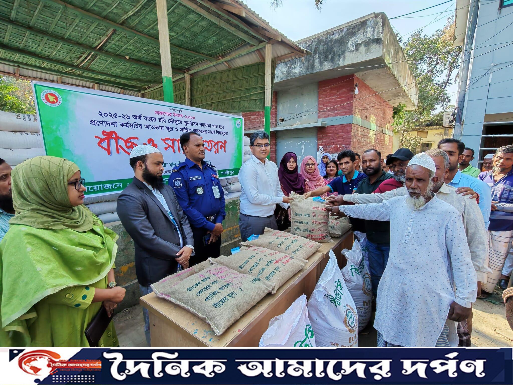 গাজীপুরের শ্রীপুরে তারুণ্যের উৎসব উপলক্ষে ২০২৫-২৬ অর্থ বছরে রবি মৌসুমে পুনর্বাসন সহায়তা খাত হতে প্রণোদনা কর্মসূচির আওতায় ক্ষুদ্র ও প্রান্তিক কৃষকদের মাঝে বিনামূল্যে বীজ ও সার বিতরন করা হয়েছে। বুধবার (২৬ সেপ্টেম্বর) দুপুরে শ্রীপুর উপজেলা কৃষি অফিসে আয়োজনে উপজেলা পরিষদ চত্বরে প্রান্তিক কৃষকদের মাঝে বিনামূল্যে বীজ ও সার বিতরন করা হয়। শ্রীপুর উপজেলা কৃষি অফিসার সুমাইয়া সুলতানা বন্যার সভাপতিত্বে প্রধান অতিথি হিসেবে উপস্থিত ছিলেন শ্রীপুর উপজেলা নির্বাহী কর্মকর্তা (ইউএনও) ব্যারিস্টার সজীব আহমেদ। আরও উপস্থিত ছিলেন, শ্রীপুর মডেল থানার ভারপ্রাপ্ত কর্মকর্তা আব্দুল বারিক, অতিরিক্ত কৃষি অফিসার লুৎফুন নাহার,কৃষি সম্প্রসারণ অফিসার,মোঃ মাহবুবুল আলম, আফরোজা সহ প্রমুখ। ব্রি ধান ৭৪, ব্রি ধান ৮৮, ব্রি ধান ৮৯, ব্রি ধান ৯২, ব্রি ধান ১০১, ব্রি ধান ১০২, ব্রি ধান ১০৫ জাতের বোরো ধানের বীজ বিতরণ করা হয়। নতুন জাতের সম্প্রসারণ, আধুনিক চাষাবাদ ও উৎপাদনশীলতা বৃদ্ধি করার লক্ষ্যে ৮৪০ জন কৃষকের মাঝে বীজ ও সার বিতরণ করা হয়।